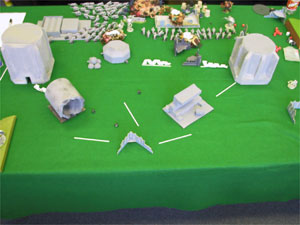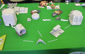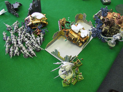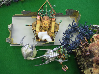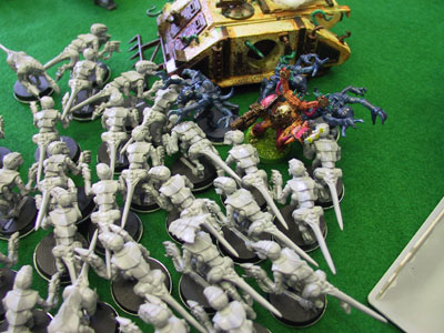 A Chaos Dreadnought arrives and charges into the horde of Spinegaunts