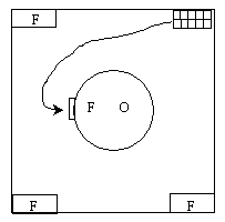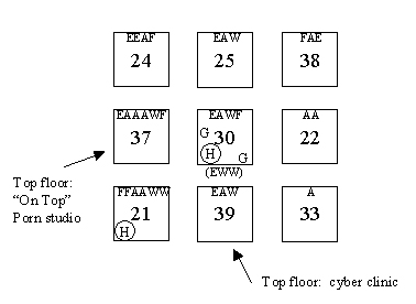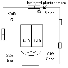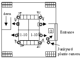 entrances and 4 drones at each corner facing elevator bank. Junkyard