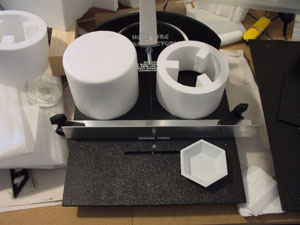 3. I carefully cut one plastic weighing dish in half with high quality shears. This would be the cover of the open silo. 4. Lay the pieces on the hardboard and test the layout.