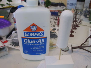 2. Meanwhile, the "missile" is being sealed with Elmer's Glue to reduce the rough texture of the filter paper and facilitate painting. [I also needed to cut down the piece eventually. I chose a height that allowed the missile to remain inside the silo cover for protection from abuse while gaming, but allowed it to still be readily visible]