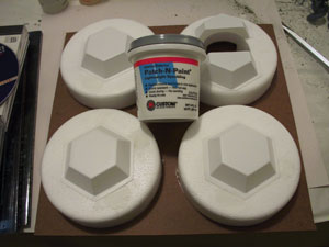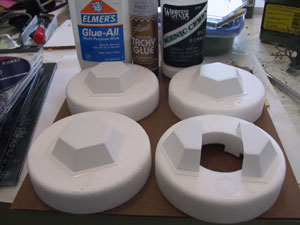 5. I affixed the foam pieces to the hardboard base with Aleene's Tacky Glue, then I affixed the plastic weighing dishes to the foam. 6. Fill in small unwanted pits (more visible in the picture above) with spackle (a.k.a. filler, polyfilla, etc.)